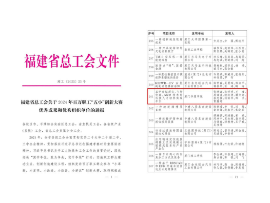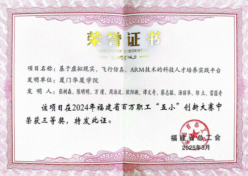近日,福建省总工会发布《福建省总工会关于2024年百万职工“五小”创新大赛优秀成果和优秀组织单位的通报》(闽工〔2025〕25号),我校信息与智能机电91牛张树森、陈明明、万瑾等教师团队的《基于虚拟现实、飞行仿真、ARM技术的科技人才培养实践平台》项目荣获2024年福建省百万职工“五小”创新大赛三等奖。这也是我校第二次在福建省“五小”创新大赛中摘得奖项。
