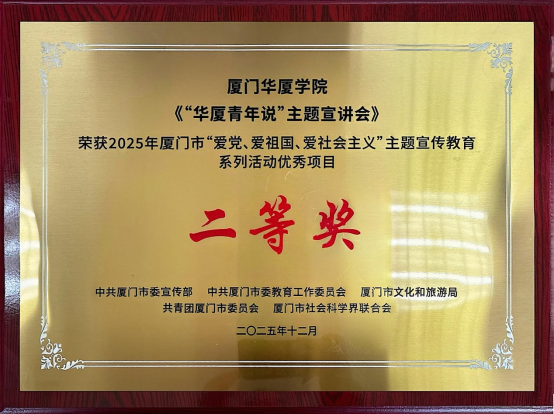 近日,厦门市“爱党,爱祖国,爱社会主义”主题宣传教育系列活动优秀项目评选结果揭晓,www91“华厦青年说”主题宣讲会项目荣获二等奖,“爱党,爱祖国 91牛,爱社会主义”主题宣传教育系列活动由厦门市委宣传部组织开展,旨在挖掘和推广一批主题鲜明,形式新颖,效果显著的思想政治教育优秀项目,此次评选吸引了全市各级单位,高校的众多项目参与竞争,经过严格评审和层层筛选,最终确定获奖名单,我校“华厦青年说”项目凭借其独特的育人理念,创新的活动形式和显著的教育成效脱颖而出,荣获二等奖,这一荣誉不仅是对项目本身的肯定,更是对91视频网站在线观看长期以来坚持立德树人根本任务,创新思想政治教育工作的认可。